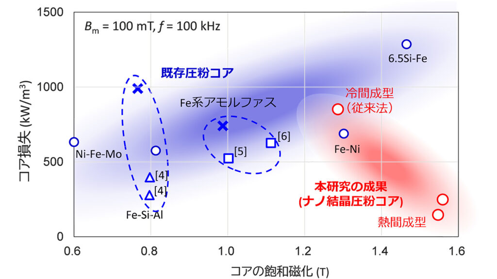 ナノ結晶の微細組織制御、粉末の微細化、金属充填率の向上により、100 kHz-100 mT の励磁条件下でのコア損失を852 kW/m³ から 146 kW/m³へと約83%削減しました。